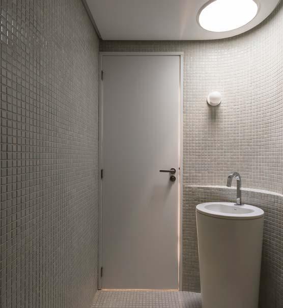 O banheiro também é revestido por pastilhas, inclusive no piso, no box e no apoio atrás da cuba. Sobre a cuba, uma claraboia igualmente redonda proporcio-