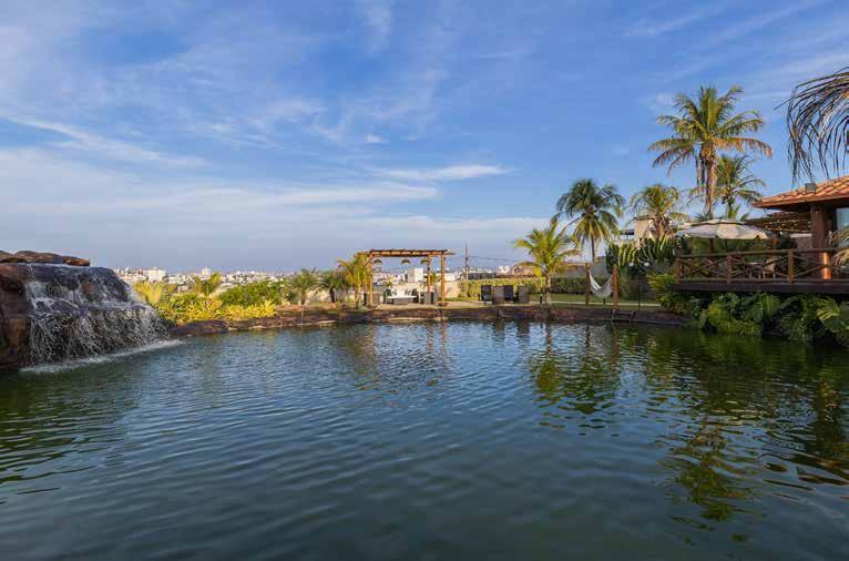 queimado. Já a divisória, revestida com ladrilho hidráulico Savona 60x60 cm, vai além da separação visual. Posicionada atrás da bancada e do forno de pizza, ela também atua como plano de fundo decorativo. Os ladrilhos hidráulicos, com padrões geométricos e florais em tons neutros, conversam com a rusticidade da madeira, o concreto da bancada e a estrutura de tijolos e telhas. Na varanda foi usada uma paleta de cores quentes e orgânicas. A cor marrom queimado do revestimento Iron 60x120 cm se aproxima do Aço Corten e harmoniza com o piso escuro em Madeira Slot Castanheira 20x100 cm, que reproduz a textura e a aparência da madeira natural. No coração do projeto, o lago artificial se destaca como ponto de contemplação e conexão com o entorno. Ele atua como espelho d’água que reflete a paisagem e a arquitetura, reforçando a harmonia entre o natural e o construído. Em seu entorno, os espaços convidam à permanência e ao descanso.