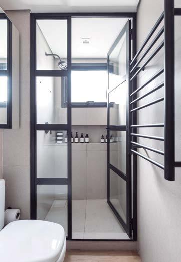 O lavabo é um encanto à parte, com suas paredes e forro trabalhados em textura velvet, muxarabis e a cuba retroiluminada em Mármore Savana. A iluminação do ambiente ficou por conta das arandelas. São detalhes que, juntos, produzem uma atmosfera de requinte e bom gosto. No banheiro da suíte também houve um cuidado especial com a iluminação. Por isso, os armários aéreos têm perfis de led embutidos. Na parede, o revestimento rose brilho Krea Miami, 10x40 cm, segue a linguagem alegre, descontraída e simultaneamente delicada, em contraponto com os metais pretos. Para reforçar a presença do preto, a serralheria do box também foi executada na mesma tonalidade escura.