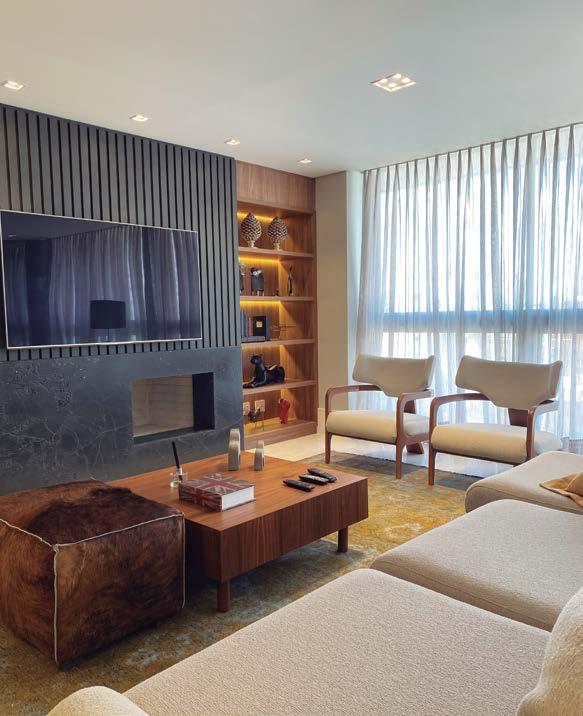 A atmosfera aconchegante é garantida pela paleta de tons terrosos, indo do off white aos tons de beges, marrons e dourados, presentes na marcenaria, nos tecidos e peças soltas, que compõem um conjunto decorativo harmonioso e agradável.