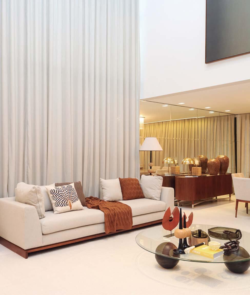 s clientes buscavam um projeto que oferecesse decoração harmônica para um espaço integrado por sala de estar, jantar e cozinha, transformando-o em uma área suave e acolhedora. Com o objetivo de acentuar a leveza da proposta, a profissional optou por um estilo mais clean, com tons neutros, madeira, vidro. O pé direito duplo e as amplas aberturas agregam sofisticação.