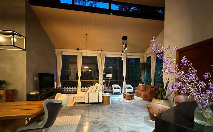 No ambiente integrado do térreo chamam a atenção o pé-direito duplo de 6 metros, que confere ainda maior amplitude ao local, e a parede da lareira revestida de pedras moledo. Essa parede avulta por sua dimensão, pois ocupa toda a altura do pé-direito. O aconchego do espaço se complementa com o projeto luminotécnico, composto por 20 pendentes com lâmpadas de filamento em iluminação quente.