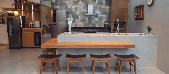 Odesafio arquitet nico do projeto desta área de lazer foi criar um espaço amplo que interligasse o exterior com o espaço gourmet da residência. As arquitetas montaram uma cozinha funcional revesti da com porcelanato cimentício e com o Adobe Moss na cor sertão, trazendo a presença simbólica de elementos naturais para o interior da casa.