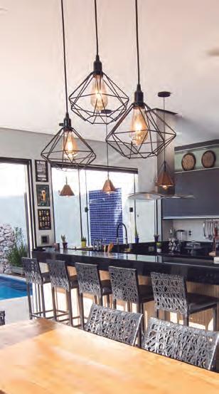 Neste projeto, o porão de uma casa foi transforma do em área de lazer, com direito a SPA e um espaço gour met, com surpreendentes clara boias. O arquiteto teve o desafio de incorporar vários elementos distintos que conferem aconche go e praticidade aos ambientes.
