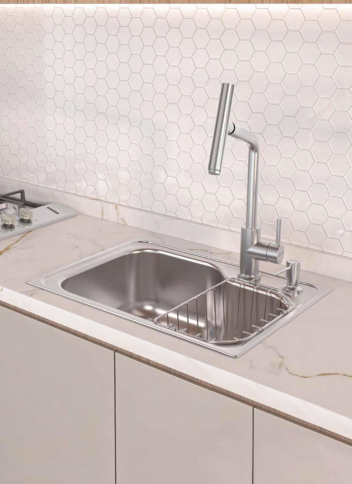 Na nova edícula pode-se ob servar a utilização do forro vinílico no teto do segundo pavimento. Internamente, o piso escolhido para a área gourmet foi o Tribeca Gre acetinado retificado hard, no tamanho 120x120cm. Já na parede do fundo foi usado o re vestimento Iseo Grigio. A cuba e o misturador monocomando, ambos em inox Black Matte, se destacam no ambiente.