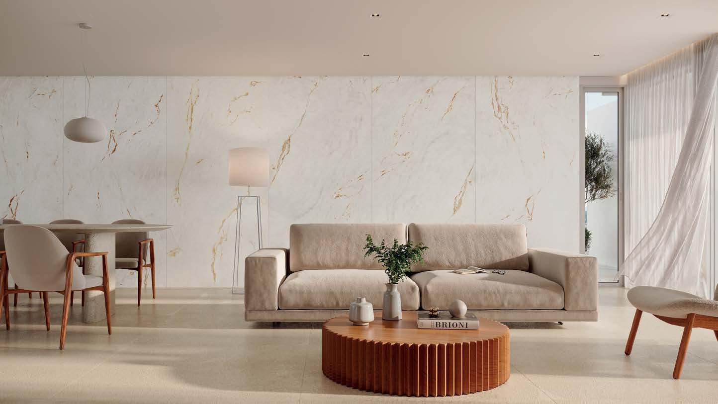 O porcelanato Cristallo Lux traduz a essência da Castelli: Superfícies com brilho intenso, acabamento refinado e proporções que ampliam a experiência de morar com arte, sofisticação e propósito.