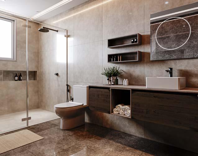 e um menino – houve a preocupação de planejar uma área íntima centrada no conforto e na praticidade. Todas as suítes têm piso vinílico em tons fechados e paredes com marcenaria ripada em tons claros. O banheiro do casal foi pensado para privilegiar momentos de relaxamento e individualidade, com banheira, iluminação direta, pias e chuveiros duplos. Os acessórios em preto equilibram-se com o Mosaico Ritallio Freccia 26x30 cm, em tonalidade também escura, contracenando com o porcelanato do piso, o Pietra Di Savoie Esmaltado 58x117 cm.