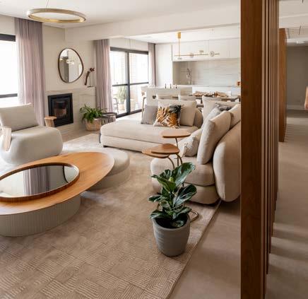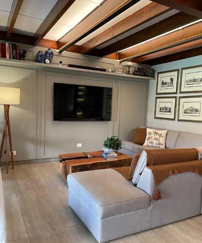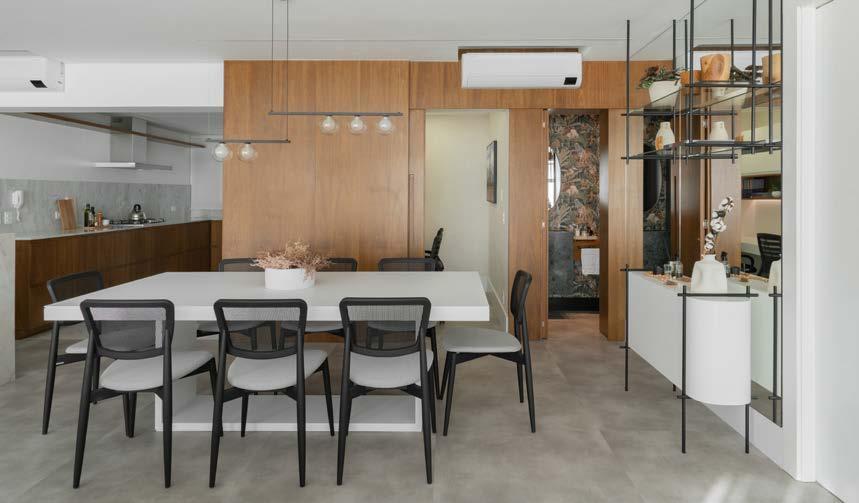 toque de suavidade. Uma das principais alterações na área social foi a escada, agora revestida em Carvalho natural, que originalmente ocupava o centro da sala. Sua realocação possibilitou uma circulação mais dinâmica e liberou espaço para integrar a varanda ao ambiente principal.