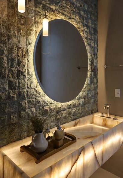 atuando ainda como peça escultural. Ao lado, um espelho bisotado amplia visualmente o espaço.