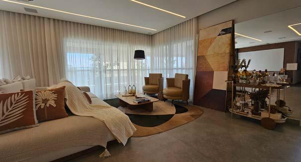 O ponto de partida do conceito criativo foi a junção entre estética e praticidade. Com pé-direito duplo e muita luz natural, a sala de estar foi criada como expressão de aconchego e sofisticação em cada detalhe. O layout favorece a circulação e o contato humano. As várias tonalidades do bege, do branco e dos amadeirados criam uma base neutra e serena, que destaca os elementos naturais e dá protagonismo à textura.