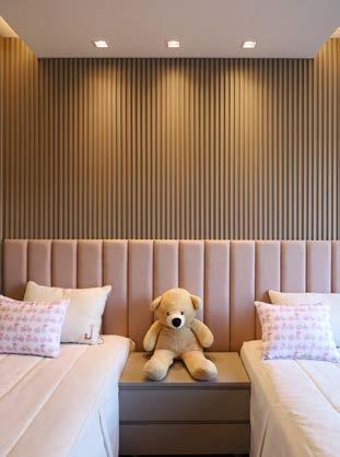 A parede com troncos integra-se ao verde dos vasos e evoca a floresta, trazendo à tona o conceito biofílico que permeia todo o projeto. Ao lado, na parede do sofá, o muxarabi em MDF Freijó filtra luz e reforça a ventilação. Cada elemento foi escolhido não apenas pelo design, mas por seu papel na experiência sensorial. Os materiais, as texturas, a iluminação suave: tudo contribui para uma atmosfera de intimidade compartilhada. Um lar que pulsa com a alegria de viver de forma genuína.