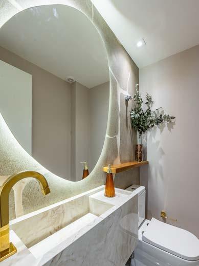 O piso do lavabo segue o mesmo padrão (Master Ducal Lux), em sintonia com a bancada em Lamtec Calacata Gold Polido e com o revestimento orgânico, o Colormix Quartzito Clover, 90x140 cm, utilizado na parede. Dando sequência a esta ideia de organicidade, o espelho completa o espaço, juntamente com os detalhes amadeirados e os acessórios dourados.