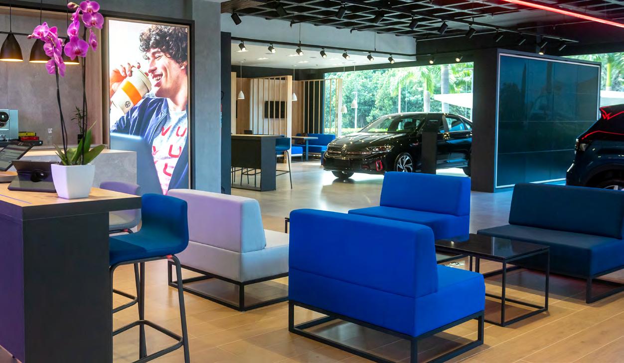 Bem mais compacta do que uma concessionária tradicional, a loja localizada em um dos endereços mais caros de São Paulo (SP) apostou todas as fichas na experiência do cliente dentro do espaço. Com capacidade para expor 4 carros, mostra todos os detalhes dos outros veículos do portfólio por meio de tecnologia de ponta. Telas sensíveis ao toque permitem a personalização de cores, especificações e itens disponíveis.