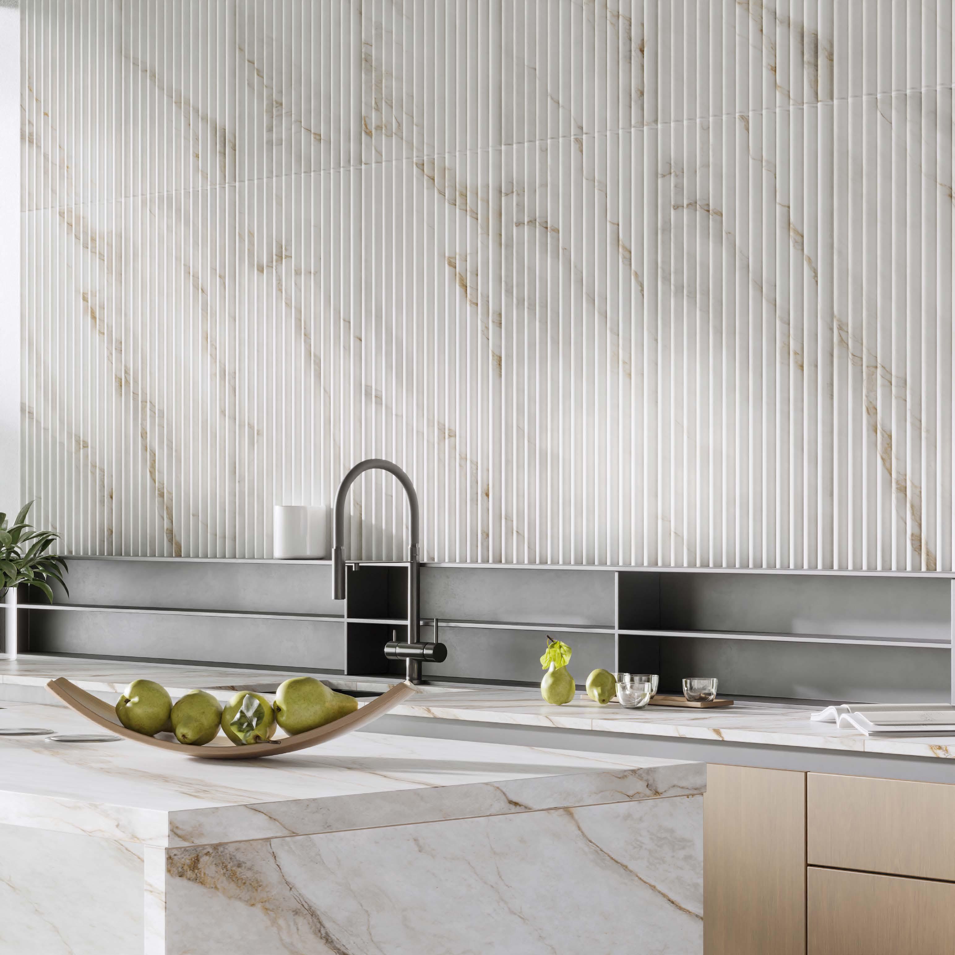 A escolha dos materiais traduz a essência contemporânea do espaço, com uma base neutra e elegante que destaca o calor da madeira e o brilho natural do sol refletido nos materiais. A bancada em Statuario Extra, linha Classic, protagoniza a composição, unindo estética e funcionalidade, realizando o desejo da cliente de ter uma bancada marmorizada. Além disso, ela