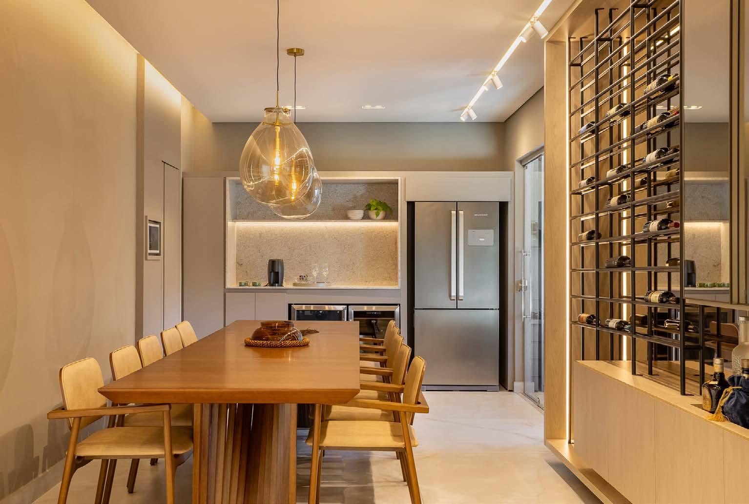 lidades quentes e terrosas, imprime textura e calor. Desse modo, há equilíbrio entre sofisticação e aconchego, tendo sempre em foco o máximo aproveitamento do espaço.