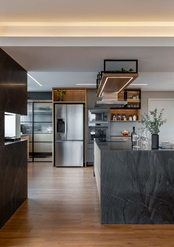 As bancadas são todas do mesmo quartzito Wakanda. As portas em perfil preto com vidro canelado e os nichos com iluminação embutida propiciam transparência e leveza, conferindo um toque contemporâneo. A iluminação valoriza cada detalhe: as prateleiras com pontos de luz embutidos realçam os objetos e o verde das plantas; já a iluminação linear sob os armários amplia a percepção de profundidade e cria uma atmosfera acolhedora.