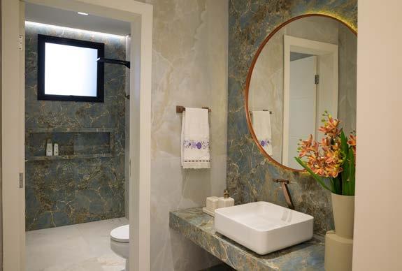 branco, banheira de hidromassagem e metais dourados. No piso e nas paredes foi usado o Gran Castello de Boullon Lux Polido 62x121 cm. Já o Durham Marmo criou uma textura diferenciada no fundo da banheira. Ainda nesse andar destaca-se o charmoso banheiro social, com revestimento Amazonita Polido 80x140 cm, combinado ao Athea 120x120 cm, ao metal de cobre escovado e à bancada em tons de azul e bege. No segundo piso também há integração entre sala e cozinha, dentro de um estilo mais arrojado, pensado para traduzir a personalidade do jovem casal. As bancadas sobressaem nesta composição:
