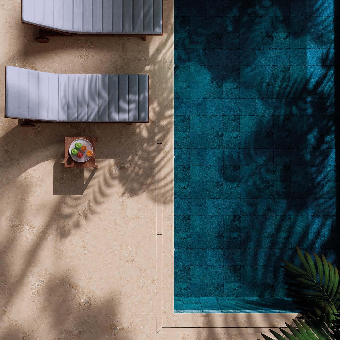 A cascata – posicionada estrategicamente acima da piscina – é o elemento central da área de lazer externa, trazendo movimento, som e frescor. A piscina tem revestimento em tons de azul intenso Timeworn BL Lux 10x20 cm, escolhido para reforçar a experiência de relaxamento. Ao redor dela foi usado o Brooklyn Grey 100x100 cm, com iluminação em LED, também aplicada na escada, realçando a volumetria e conferindo elegância ao ambiente noturno.