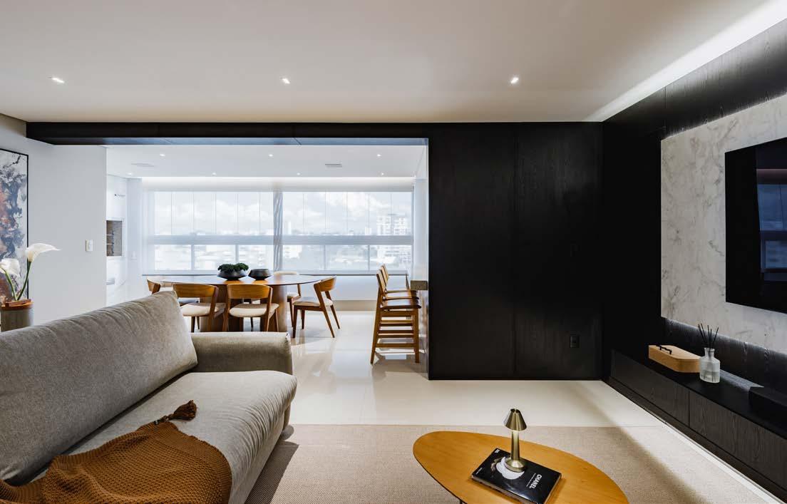 O painel amadeirado em Louro Freijó aquece o espaço, produzindo uma atmosfera de sofisticação contemporânea, em harmonia com as peças decorativas e a disposição funcional dos ambientes. A iluminação valoriza os volumes arquitetônicos e destaca texturas, como a do mármore Calacata Ouro da parede da TV. Nos revestimentos, destaca-se o piso Ônix Bianco Satin 120x120 cm, que trouxe elegância e um