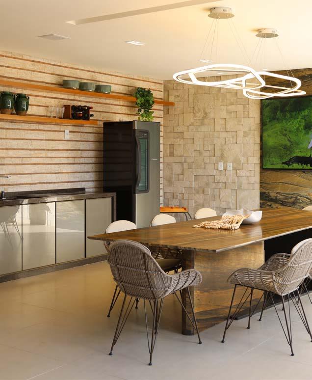 e marcenaria em tons claros. Ela se conecta à varanda gourmet, onde o revestimento Filetado Stone Acetinado 43x63 cm cobre a parede central da bancada, em Granito Marron Café. A mesa, com base em Quartzito Sândalos e tampo em Granito São Gabriel, é destaque. O piso, uma base neutra, recebeu o Cemento Grigio 90x90 cm.
