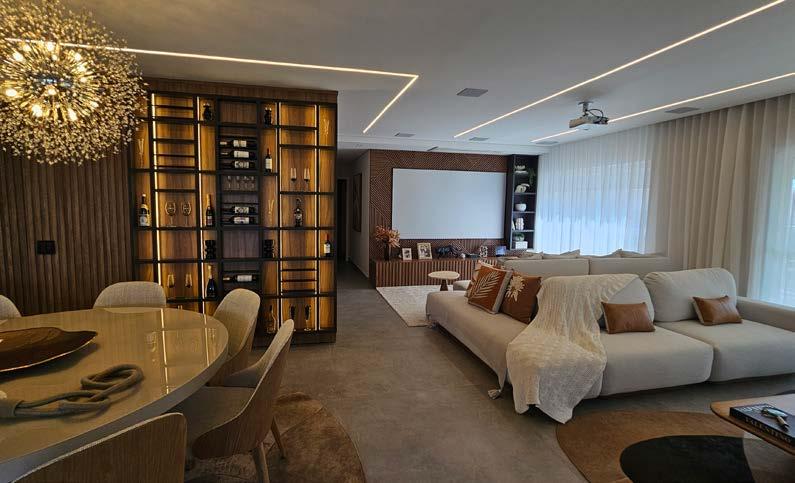 O painel amadeirado em Louro Freijó aquece o espaço, produzindo uma atmosfera de sofisticação contemporânea, em harmonia com as peças decorativas e a disposição funcional dos ambientes. A iluminação valoriza os volumes arquitetônicos e destaca texturas, como a do mármore Calacata Ouro da parede da TV. Nos revestimentos, destaca-se o piso Ônix Bianco Satin 120x120 cm, que trouxe elegância e um