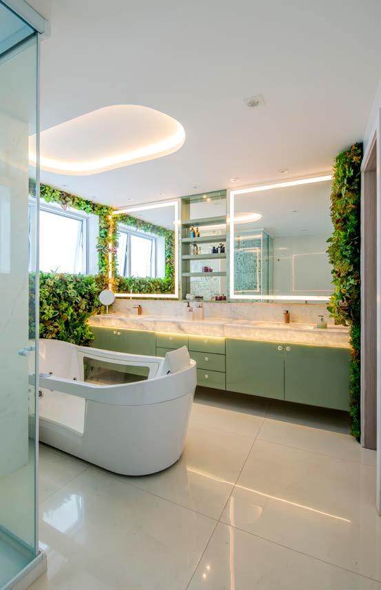 A parede do box recebeu um painel de cerâmica florido (Inserto Fler 20x20 cm) que harmoniza com as paredes cobertas de vegetação natural e com a marcenaria em tom suave de verde. O cenário convidativo se complementa com a charmosa banheira de hidromassagem. Sobre ela, foi simulada uma claraboia com formato orgânico e luz branda. A bancada em mármore Onix iluminada por dentro é outro diferencial, realçando os veios da pedra e os jardins das laterais.