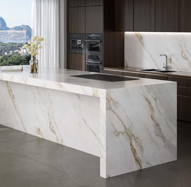 A cozinha tem bancada em lâmina Ultra Compacta Calacata