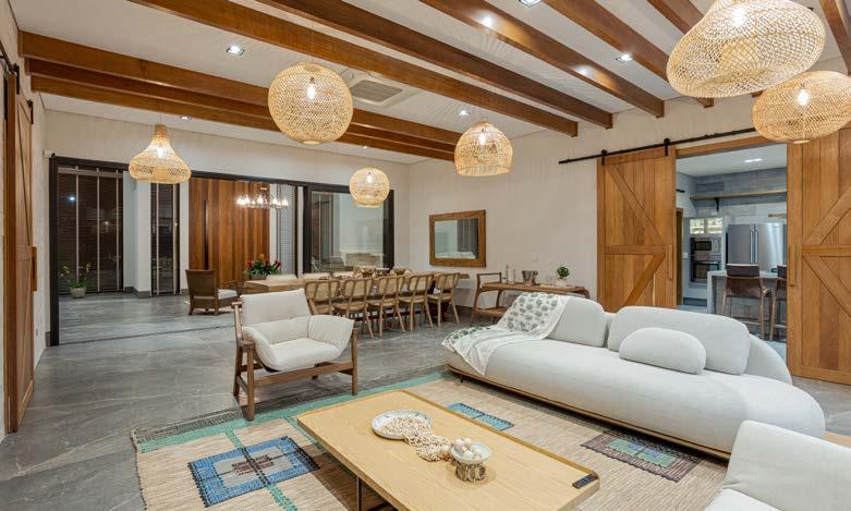 A presença da madeira também é significativa, reforçando a narrativa acolhedora do ambiente. Já o pé-direito alto e as grandes aberturas criam uma continuidade com a paisagem natural do entorno.