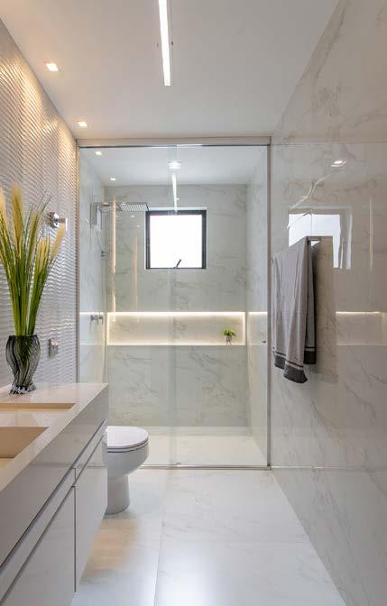 Outro aspecto importante são os dois chuveiros, que garantem uma experiência de banho revigorante. O box, que se estende até o teto, não somente incrementa a sensação de amplitude como manifesta o compromisso do projeto com a modernidade decorativa.