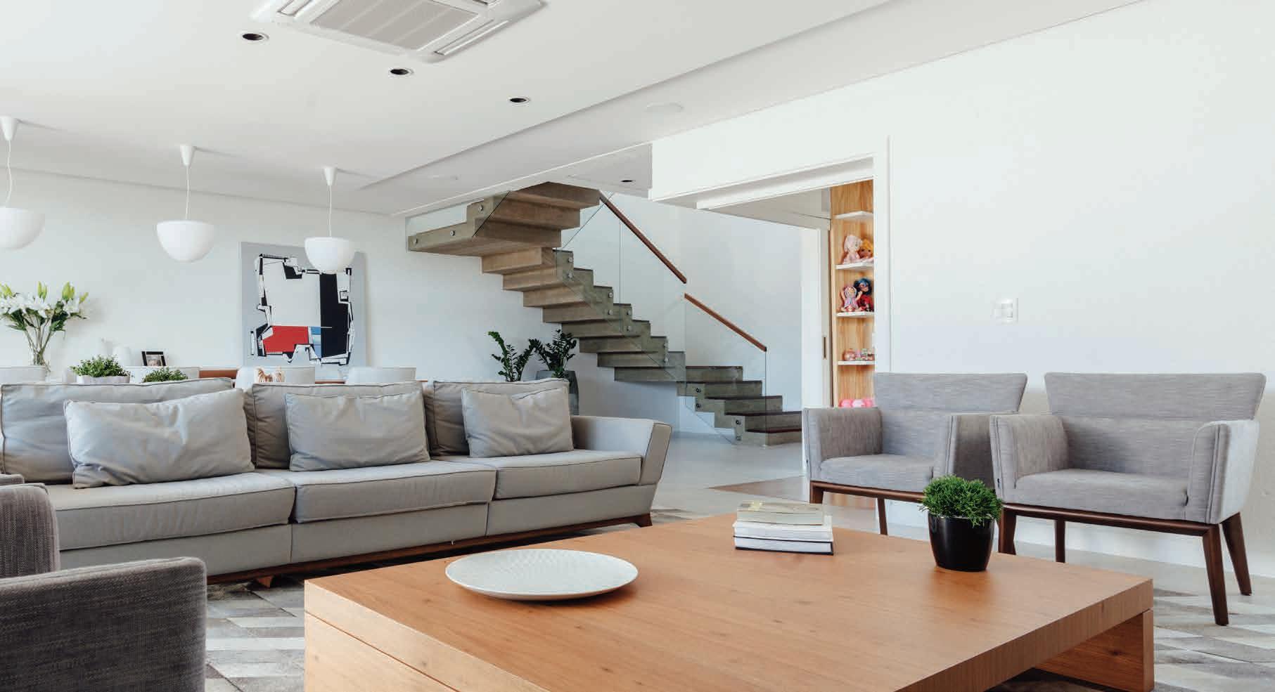Situada en un condominio, la residencia de 483 metros cuadrados tiene como principal característica los amplios espacios integrados, elaborados para recibir con confort a familiares y a amigos. Al concebir el proyecto, el arquitecto Marcelo Samara distribuyó el programa de necesidades en dos niveles, lo que resultó en una arquitectura contemporánea, tanto en la volumetría como en la decoración, ambas ricas en revestimientos y texturas. Samara transformó los ambientes de la casa en espacios sofisticados donde el mobiliario Saccaro gana destaque.
