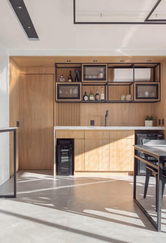 A pedido dos clientes foi mantido o pé-direito mais alto (com mais de 3m) e também fo ram incorporados diversos aces sórios de home bar: cervejeira grande, adega climatizada, má quina de gelo e chopeira naja de bancada. Chama a atenção a ilha em quartzito, uma pedra natural
