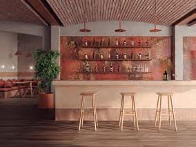 Inspirada nesse material, a ROCA apresenta diversos modelos de porcelanatos. A partir da tecnologia de impressão HD, oferece uma grande variação de desenhos e padrões entre as peças, per mitindo composições que se assemelham ao processo natural de oxidação do aço corten. Intensa e vibrante, a linha Red Stone traz a textura marcante das superfícies oxidadas e desgastadas pelo tempo. Os projetos ganham um ar de ousadia devido ao brilho in tenso da linha, que conta ainda com bordas retificadas e dimensão de 90X90cm. E a série Fire, em formato lâmina, 120x250cm, re produz com perfeição todas as peculiaridades do corten e reações ao tempo, imprimindo ares de desgaste natural.