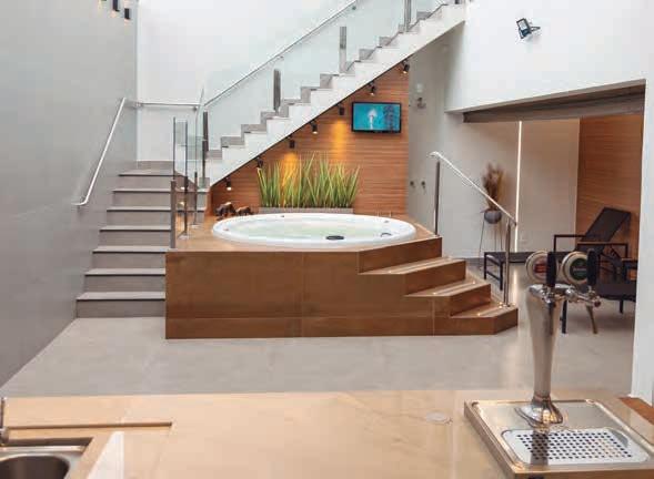 Neste projeto, o porão de uma casa foi transforma do em área de lazer, com direito a SPA e um espaço gour met, com surpreendentes clara boias. O arquiteto teve o desafio de incorporar vários elementos distintos que conferem aconche go e praticidade aos ambientes.