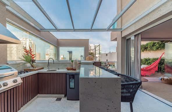 Odesafio arquitet nico do projeto desta área de lazer foi criar um espaço amplo que interligasse o exterior com o espaço gourmet da residência. As arquitetas montaram uma cozinha funcional revesti da com porcelanato cimentício e com o Adobe Moss na cor sertão, trazendo a presença simbólica de elementos naturais para o interior da casa.