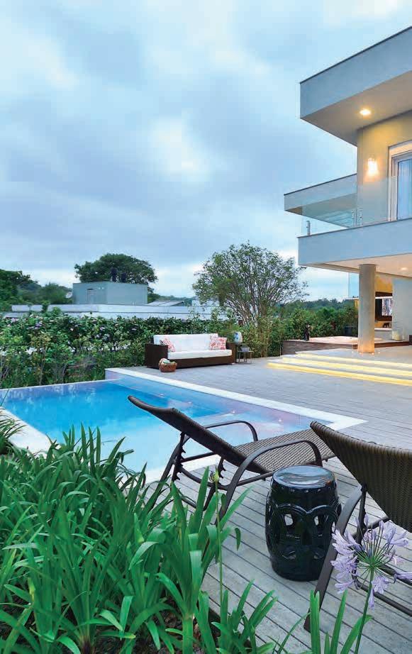 Este espaço foi projetado para que os moradores pudessem realizar o sonho de uma piscina suficientemente ampla para nadar e ainda reunir a família nos momentos de la zer. No seu entorno, o piso em porcelanato Giardino, 90x90cm, lembra um deck de madeira. Na parte interna da piscina, além da raia de 10x2m de largura, há uma “prainha”, com espaço para espreguiçadeiras e uma profundidade de apenas 20cm. Os degraus permitem maior co modidade de uso, enquanto a floreira – que está na divisa e de