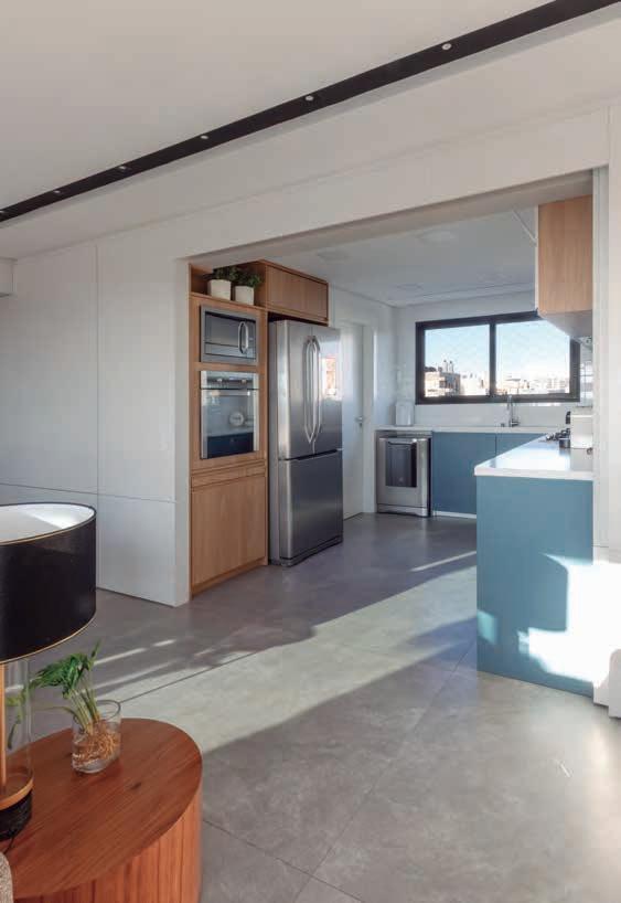 A cozinha contou com um revestimento e tro Natural branco, 7, x1 m. Porém, a configura ção diferenciada conferiu originalidade ao espaço. Ambientada nas tonalidade azul e branca, a co zinha faz um contraste ao estilo industrial e às cores neutras da área social. Quando se abre a porta divisória de quase m de largura, os am bientes ficam conectados. A área da churrasquei ra, em contrapartida, está totalmente integrada à sala de estar e acaba sendo o ponto focal para quem entra no apartamento.