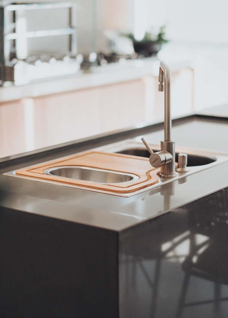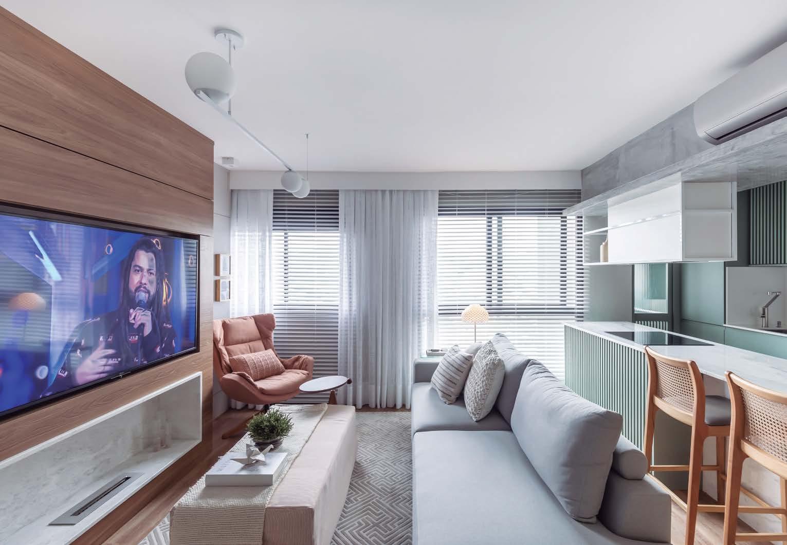 todos os eletrodomésticos são embutidos, inclusive a geladeira. Já a ideia de estabelecer um contraponto à marcenaria delicada e clarinha, na cor verde-jade, motivou o uso de uma linguagem industrial, traduzida na textura de cimento queimado que deu vida e personalidade ao forro deste espaço. Por sua vez, a circulação foi demarcada com o perfil iluminado, que inicia no hall de entrada e adentra a cozinha. O elemento de uniformidade aplicado em todo o apartamento é o piso vinílico Papoula, 20,8x123 cm.