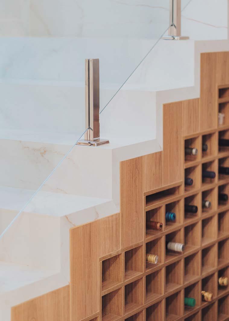 O painel ripado em MDF com acabamento em laca branca também traduz a sofisticação característica dos clientes, já que conecta todo o ambiente social e estabelece um pano de fundo para a decoração e as peças artesanais autorais. Além disso, possibilita a mimetização da porta do lavabo e da cristaleira. Seguindo essa mesma linha, o piso vinílico Montelupo concreto, 91x91 cm, complementa a base da ambientação, imprimindo maior singularidade ao ambiente.