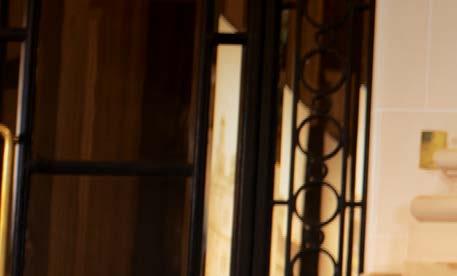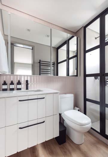 O lavabo é um encanto à parte, com suas paredes e forro trabalhados em textura velvet, muxarabis e a cuba retroiluminada em Mármore Savana. A iluminação do ambiente ficou por conta das arandelas. São detalhes que, juntos, produzem uma atmosfera de requinte e bom gosto. No banheiro da suíte também houve um cuidado especial com a iluminação. Por isso, os armários aéreos têm perfis de led embutidos. Na parede, o revestimento rose brilho Krea Miami, 10x40 cm, segue a linguagem alegre, descontraída e simultaneamente delicada, em contraponto com os metais pretos. Para reforçar a presença do preto, a serralheria do box também foi executada na mesma tonalidade escura.