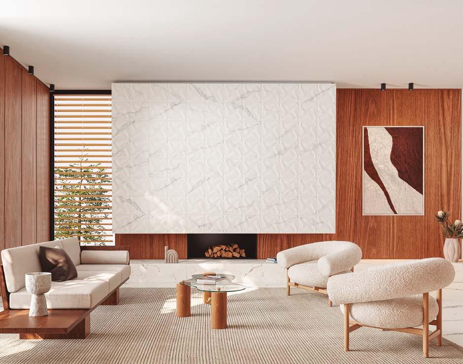 revela um traço mais romântico, incorporando toques poéticos ao universo dos cimentícios. Seis palavras aparecem esculpidas à mão nas peças: energia, sentido, tempo, cuidado, proteção e memória. Além da versão escrita, foram criadas também peças em fundo liso, para compor a paginação. O efeito irregular obtido com esse produto é inspirado no trabalho artesanal, e ele é indicado para paredes internas e externas. As cores são o bege (argila) e o branco (shell). Toda a coleção da Decortiles se relaciona a quatro temáticas: o minimalismo natural e o conforto sensorial; a argila em conexão com a terra, remetendo a origens e misticismo; a arte de mimetizar a natureza com a biomimética; o processo feito à mão, celebrando a criatividade humana e a exclusividade do artesanal.