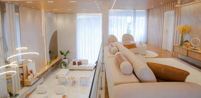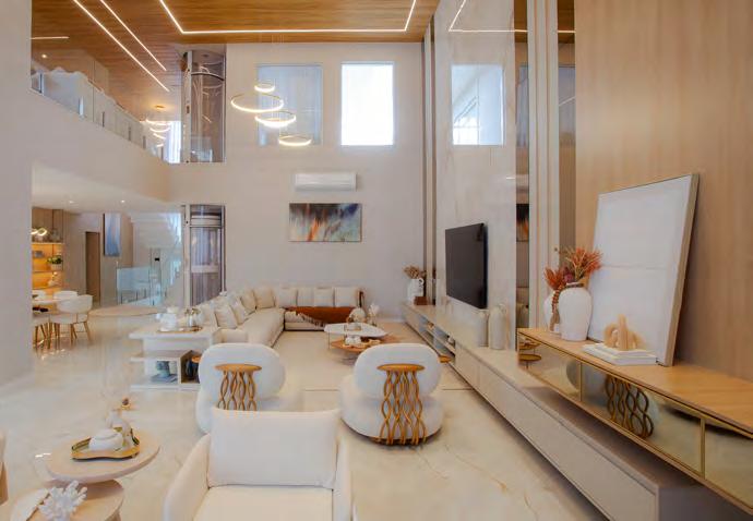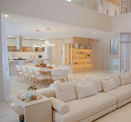 mesmos metais Rose Gold. Já no banheiro master, o destaque ficou por conta do Palazzo Ducale polido 81x140 cm, que sobressai no cenário, conferindo ao ambiente uma atmosfera de sofisticação e beleza.