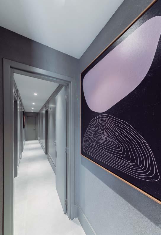 Nos quartos, destacam-se a boiserie em cinza e os painéis canelados e iluminados acima da cama, que proporcionam sensações de leveza e acolhimento, além de criarem discretos efeitos de luz e movimento nos ambientes.