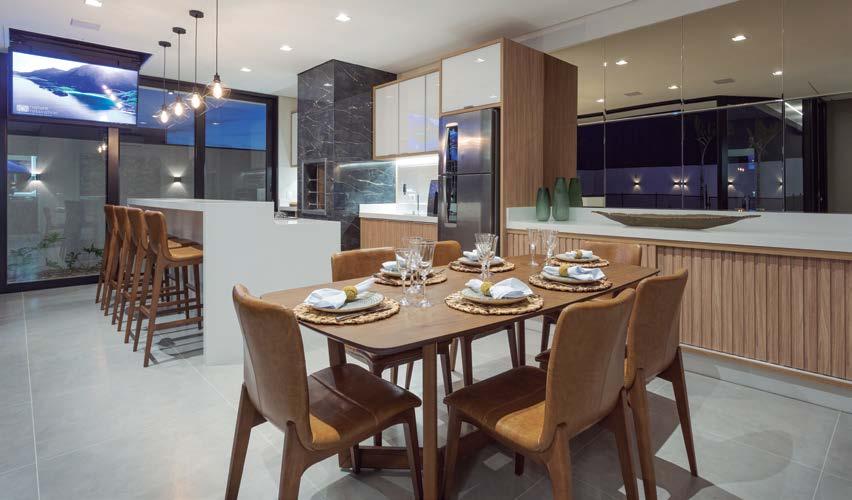 onde o verde natural é soberano. Grandes espaços são a tônica no interior, com conforto e sofisticação na medida. As divisórias e portas em vidro também intensificam a sensação de amplitude e de total conexão entre os ambientes.