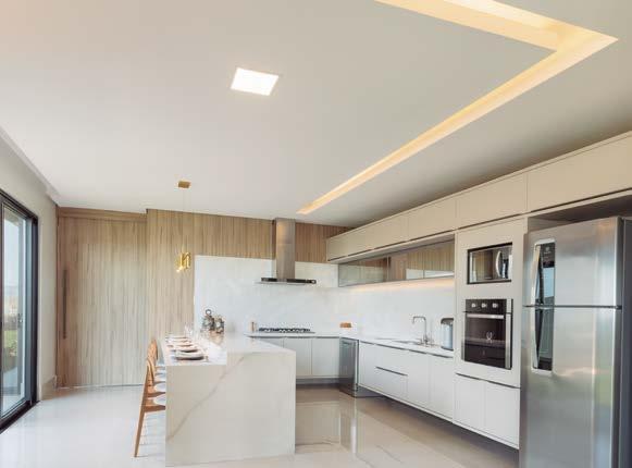 escolha dos revestimentos, a paleta de tons mais claros, o uso da madeira e o projeto de iluminação conferem um aspecto clean, atemporal e uma sensação de aconchego para esta cozinha de 30 m². Os clientes buscavam um ambiente moderno e sofisticado, com foco em funcionalidade. A triangulação de geladeira, cuba e fogão, além da opção por itens embutidos, como lixeira, calha úmida e fruteira, atende a esse desejo. Também por isso a presença de grandes bancadas e de muitos armários no ambiente, que se integra à área gourmet. O porcelanato Onix 1,20x1,20 m das bancadas contribui para a sensação de elegância. Destaque para a combinação de iluminação indireta, ótima para os momentos de refeições, e iluminação direta, própria para o preparo de alimentos, por meio de placa de led e de perfil de led embutido no armário.