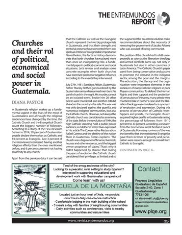 the supported the counterrevolution make recommendations about the necessity of removing the government of Jacobo Árbenz who was accused of being communist. The position of the church had to shift unexpectedly as soon as the liberation theology and armed conflicts came up, not only in Guatemala but also in other countries of Latin America. The Catholic Church’s paper went from being conservative and passive to promote the demand in the indígena sector, among the poor and the margins. The education, the literacy and the organization were important elements in the endeavor of many Catholic religions in poor Mayan communities. To defend the Human Rights and their support and the protection of persecutors of the army, many priests were murdered (like in Rother’s case) and the liberation theology was considered as a synonym of revolution and subversion. During this process of persecution of Catholic worshippers and priests, the Evangelic church acquired higher profile in Guatemala raising the percentage of followers from 19.10 percent to 30 percent. according a research from the Ecumenical and Christian Council of Guatemala. For many survivors of the war, the benefits that the mentioned Evangelics gave them in times of poverty and persecution were reasons enough to convert from Catholic to Evangelic. CONTINUED ON PAGE 17...