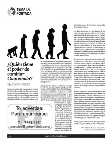 TEMA DE PORTADA los niños menores de cinco años padecen de desnutrición crónica. Los datos anteriores, son solo algunos de los retos a los que los guatemaltecos se enfrentan a diario. Se trata de luchar para comer y luchar aún más para estudiar, porque muchos llegan a la escuela con el estómago vacío, con frío, cansados después de caminar largas distancias y exponiéndose en muchas ocasiones a diversos peligros. Eso, si se tiene la suerte de estudiar, ya que no existen incentivos para la educación y por lo tanto es menos complicado para muchos trabajar para ganar algo de dinero y poder sufragar sus necesidades, sin pensar en estudiar para el futuro.