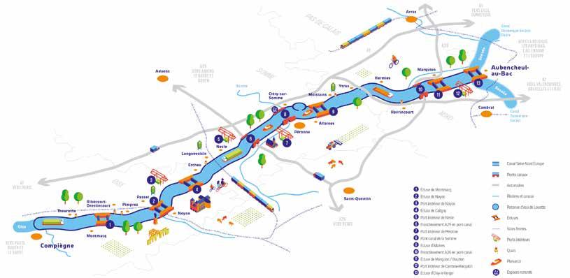 107 km de Canal à grand gabarit européen Vb, entre l’Oise (Compiègne) et le canal Dunkerque-Escaut (Aubencheulau-bac).