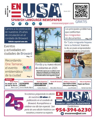 In June 2002, our monthly publication was created due to the need at that time to have a newspaper that would disseminate in our own language, the programs, events and activities developed in Broward County. We thus decided to dust off all that useful information generated in the cities of the county, translate it into Spanish and publish it in a simple language that is easy to digest by our readers. En USA focuses on what happens here, in our own backyard. It is a non-stop newspaper that informs and educates the Hispanic community about programs, events, activities of local government offices, non-profit institutions, and the private sector, so that Hispanics participate and integrate into the affairs of the cities where they live, work and raise a family. In general, it focuses on the economic, political, social and cultural aspects from the United States.