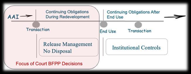 Institutional Controls. A lack of case law leaves uncertainty as to exactly what is required. However, EPA’s Common Elements Guidance stresses the importance of IC monitoring and additional EPA Guidance on advanced approaches for IC monitoring15 lists many IC monitoring approaches, which could prove instructive to future courts. If courts prove as exacting as they have in other BFPP cases, it seems likely that institutional control compliance questions will be similarly analyzed.