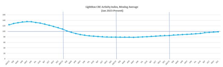 Looking ahead, the 12-month moving average is expected to surpass 100 by late 2026, marking the strongest signal yet of a sustained, broad-based CRE recovery, assuming current momentum continues without significant market disruption